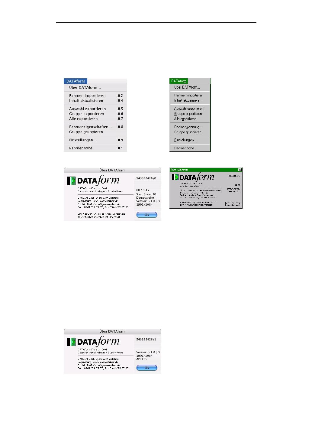 Starten Sie QuarkXPress wieder und rufen Sie DATAform/Über DATAform auf. Wenn Sie